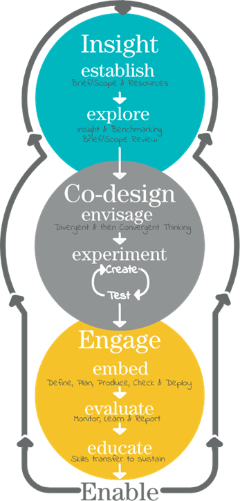 We engage with our partners to embed change. We evaluate what we’ve designed to further our learning and understanding. We transfer skills and assets across to individuals, organisations and communities to sustain transformation.​
