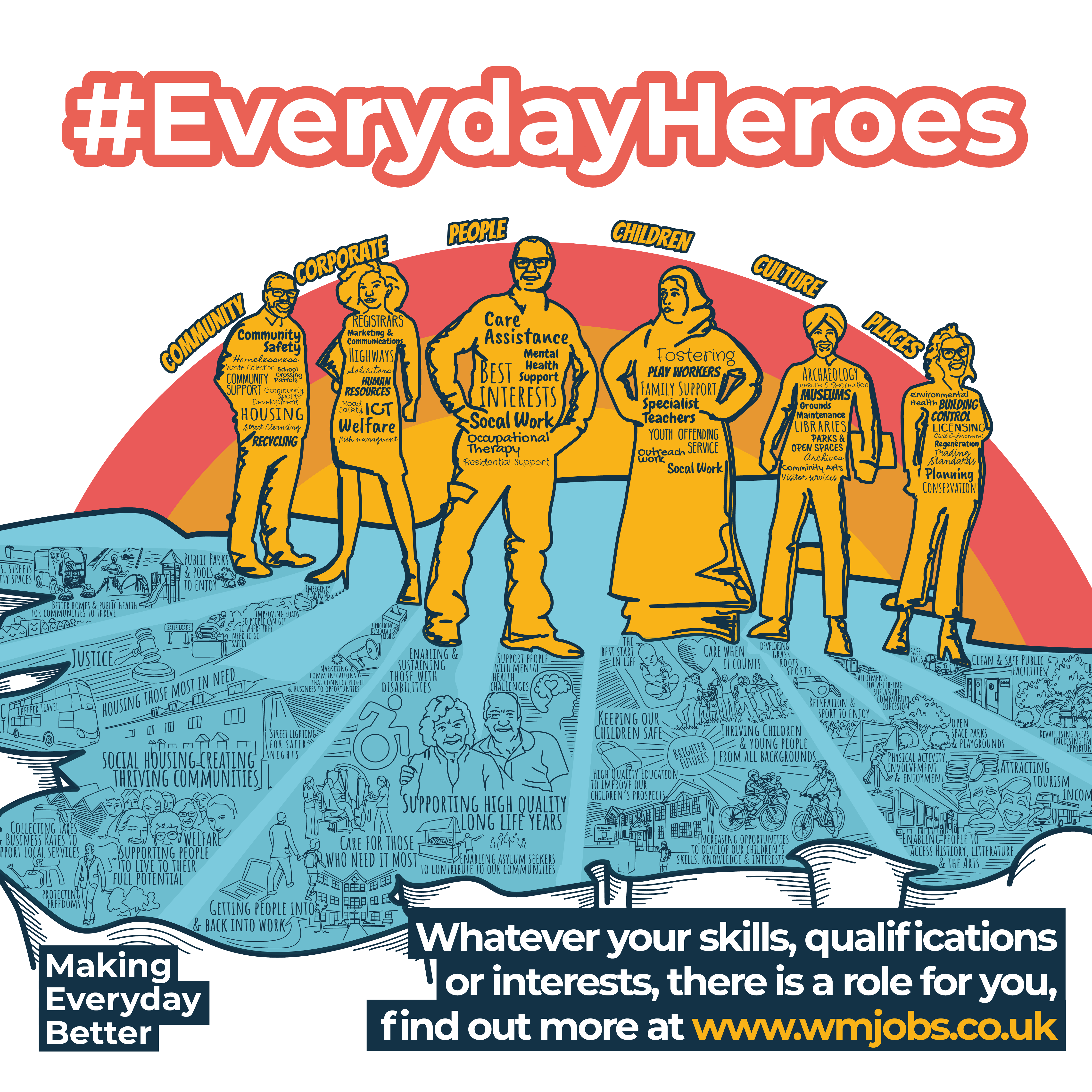 We developed a creative concept that build the story from the West Midland landscape, slowly introducing each role as a superhero with their specific impact in the hero's shadow, which eventually built to a complete picture featuring six heroes covering People, Places, Culture, Children, Corporate and Community